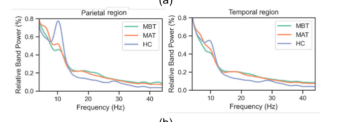 图4:干预前、干预后 和 HC 在顶叶与颞叶的相对功率谱