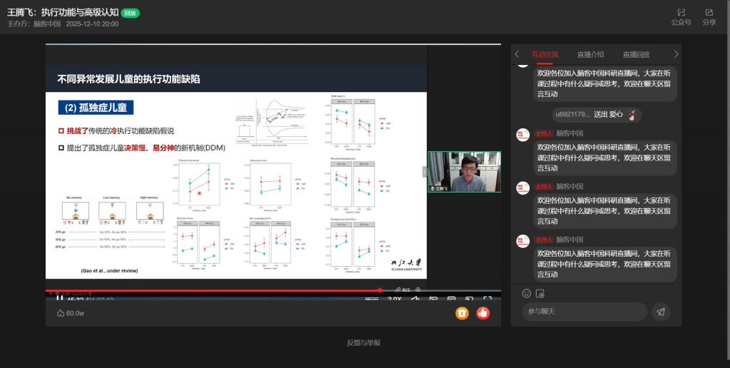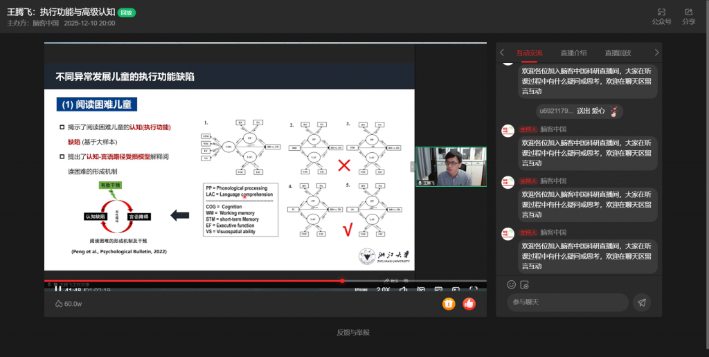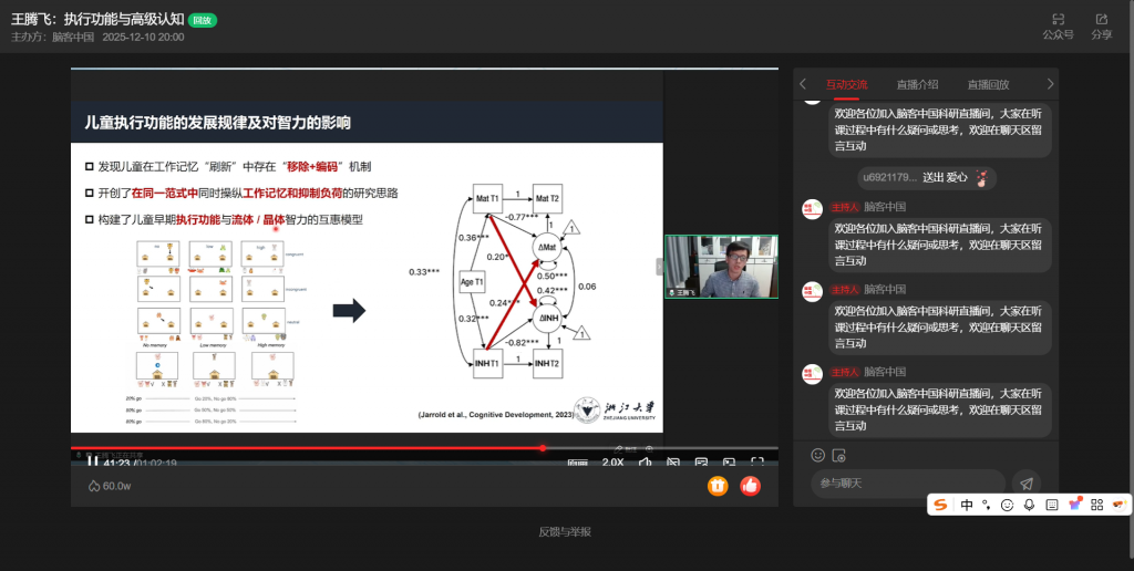 12月10日,浙江大学王腾飞教授做客“脑客中国・科研直播”,以“执行功能与高级认知”为主题,按“执行功能与高级认知、执行功能的正常开展、执行功能的异常开展”三部分展开分享,深度解析执行功能的核心机制与实践价值。