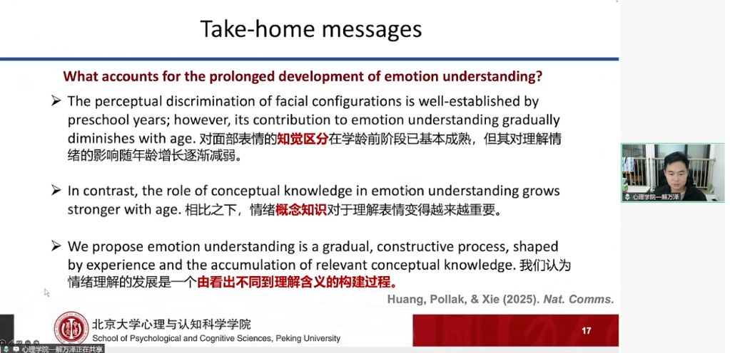 情绪是包含身体反应、主观体验、认知理解的复杂过程,而解博士研究团队的核心研究主线围绕人类情绪开展展开,即探索“人类的情绪从何开展而来”。这一宏大命题具体落实在三个相互关联的维度:其一,婴幼儿和儿童如何理解他人的情绪,即“向外看”;其二,儿童如何感受和体验自身的情绪,特别是内感受信号的作用,即“向内听”;其三,在前两者的基础上,进一步探究儿童情绪问题产生的根源。本次报告重点聚焦于前两个维度,分享了在情绪理解与情绪体验方面的最新进展。